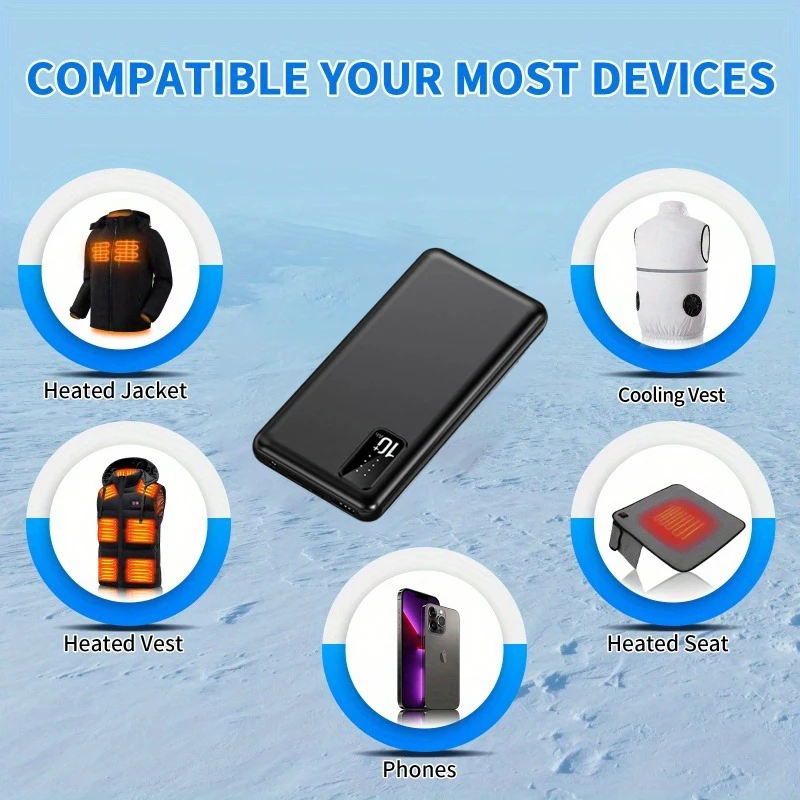 Compatible with:for all mobile phones, for ipad, for tablets ,for Heating jackets,for Heating vest, for Heating gloves, for air conditioning clothing, for Palace Warming Belt, for Heating insole,for Heating eye mask, etc.