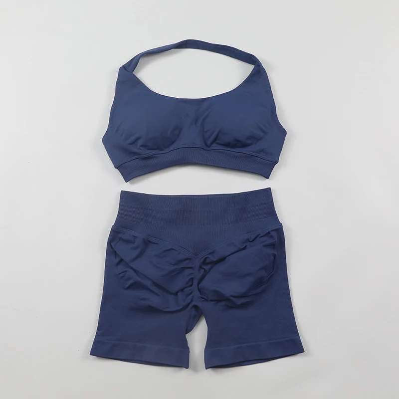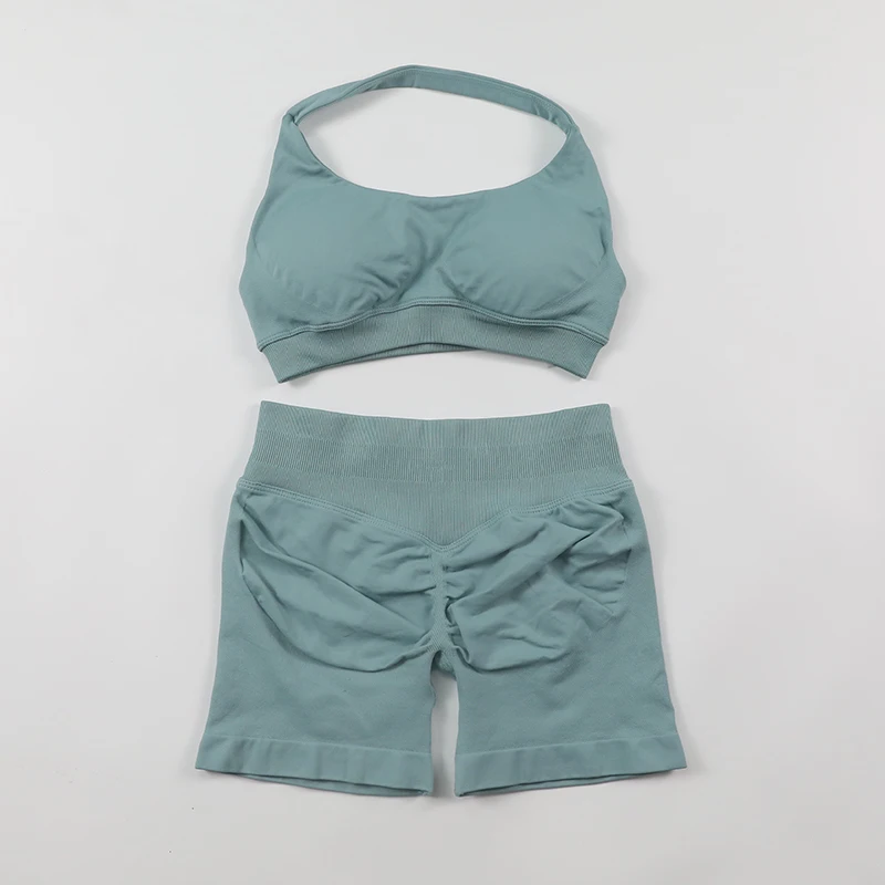 2 Piece Seamless Low Waist Scrunch Shorts And Halter Sports Bra Yoga Set