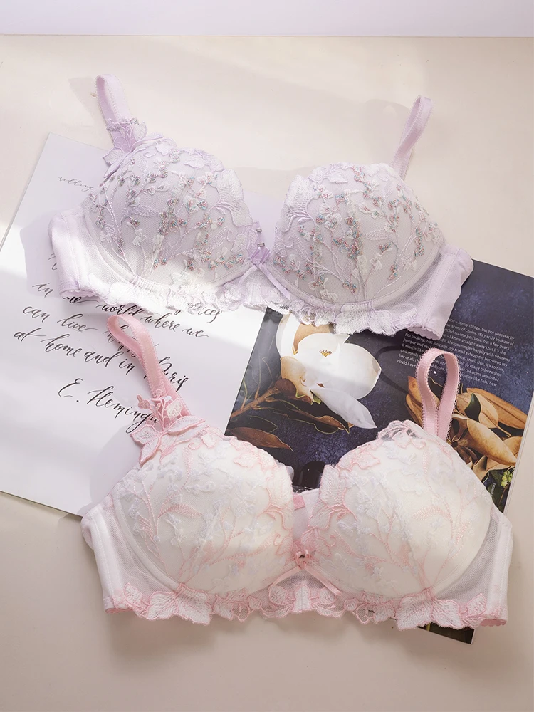 Japanese sweet cute girls lingerie without steel ring low chicken heart gathered embroidered flowers underwear set women bra sets