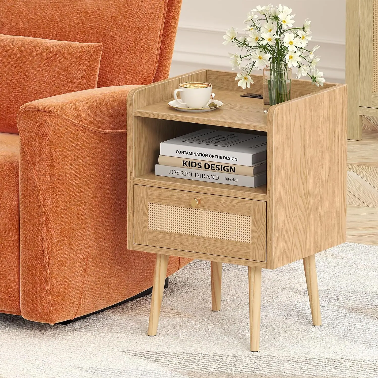 1. Rattan Nightstand with Charging Station, Mid Century Modern Bed Side Table, Boho End Table with Wood Legs (2, Natural)