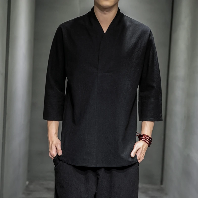 3 reviews for Shirts Men Solid Pullover V Neck Three Quarter Mens Kimono Shirts Traditional Streetwear Blouse Chinese Style Linen Shirts Man