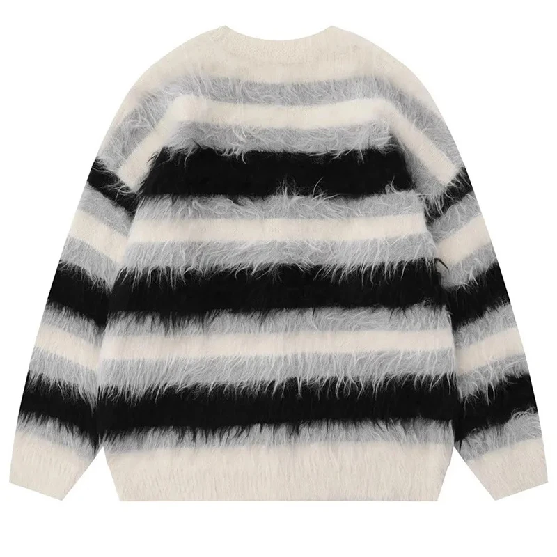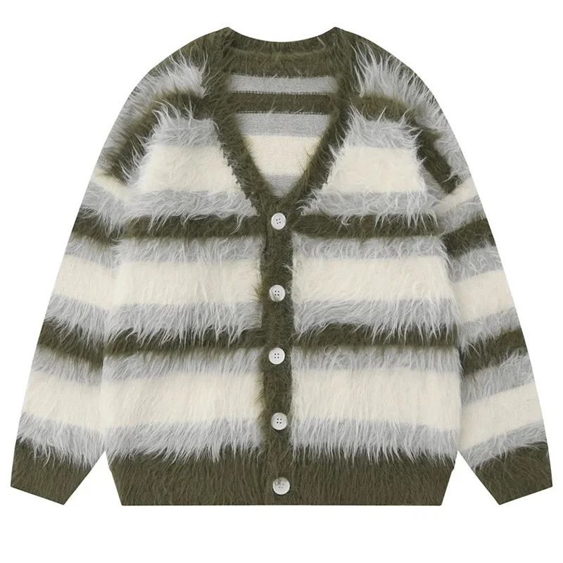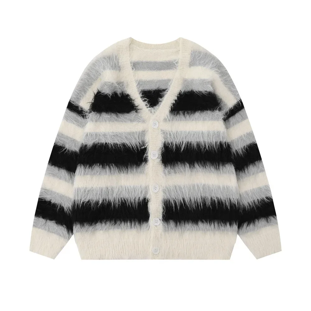 Striped Plush V-neck Sweater Men's Loose Casual Brushed Knit Trendy Couple Versatile Comfortable Harajuku High Street Cardigan
