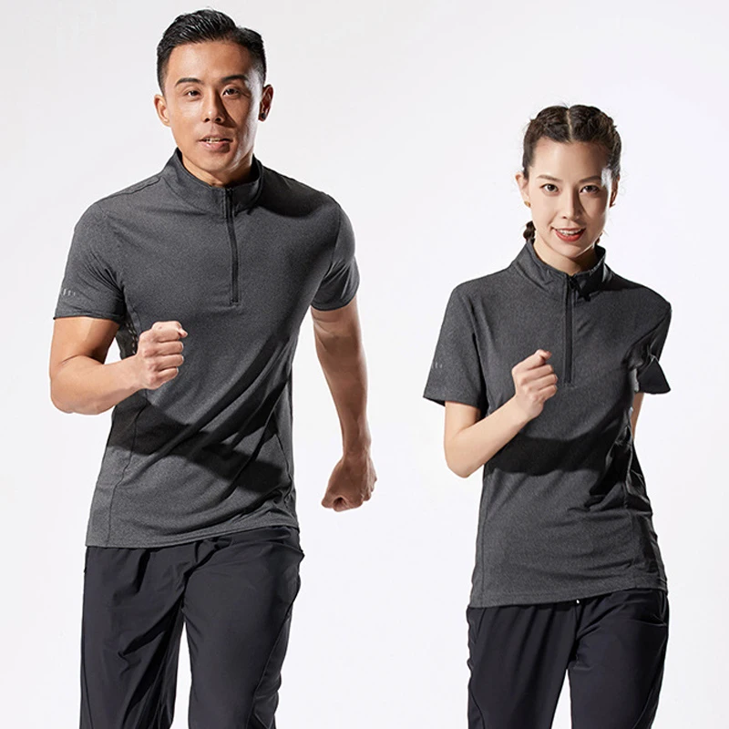 • Sale! Breathable Short Sleeve Zipper collar Men Running Fitness Tshirt elastic Quick Dry Sports Bodybuilding tennis Training Shirts